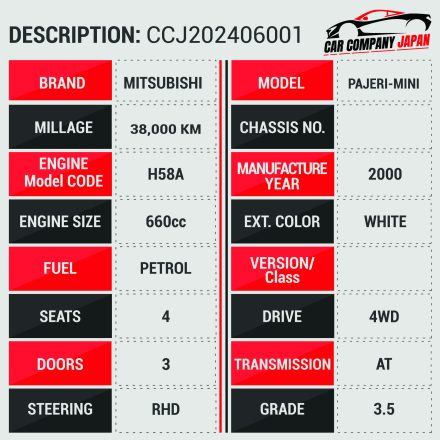 The Mitsubishi Pajero Mini 2000 is a compact SUV that blends rugged off-road capability with the convenience of a small urban vehicle. Designed to meet Japan’s kei car regulations, it features a 660cc engine that offers both fuel efficiency and reliable performance. Despite its small size, the Pajero Mini retains the tough, boxy styling of its larger Pajero sibling, making it stand out with its adventurous appearance.